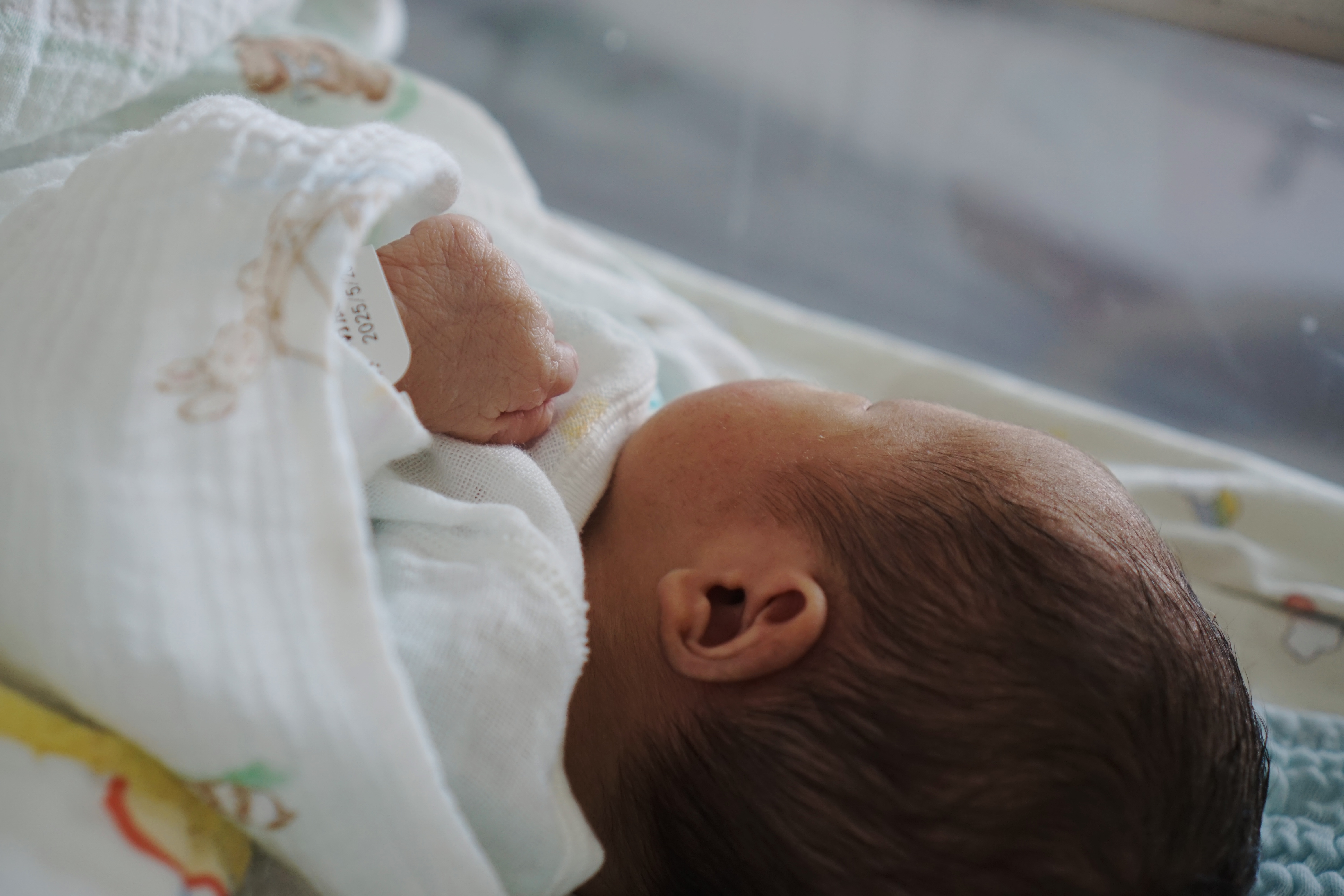 进入产房后,一阵阵宫缩带来的剧烈疼痛让 CC 脸上直冒冷汗。数小时的拉扯中,由于大腿比较僵硬,导致派派的头一直出不来。经验丰富的助产师让 CC 侧着身子生产,终于将派派慢慢地拉出(字面意思的拉出)。